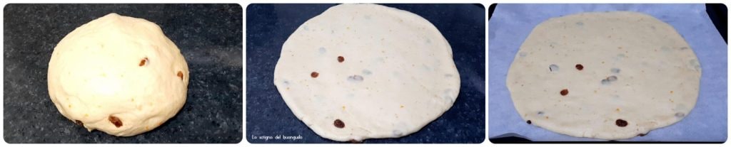 Former un cercle assez large et d’environ 2 centimètres de hauteur, le transférer dans un moule, j’ai utilisé la plaque du four en la tapissant de papier sulfurisé, car il ne rentrait pas dans les moules que j’avais.