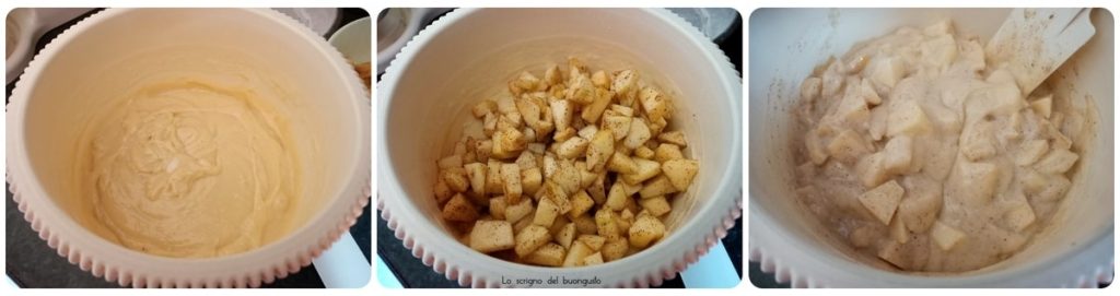 Les mettre dans deux bols différents, assaisonner celles en dés avec du citron, de la cannelle et du sucre et les mélanger, celles en tranches uniquement avec une pulvérisation de citron, juste pour ne pas qu’elles brunissent.