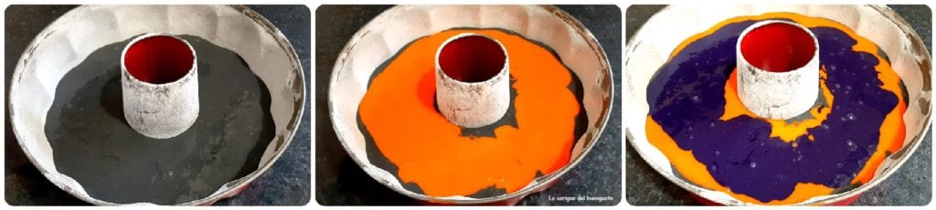 Préparer un moule à kouglof de 26 cm de diamètre en le graissant et en le farinant bien, à ce stade couvrir le fond de la plaque d’abord avec le mélange noir, puis avec le mélange orange et enfin avec le mélange violet.