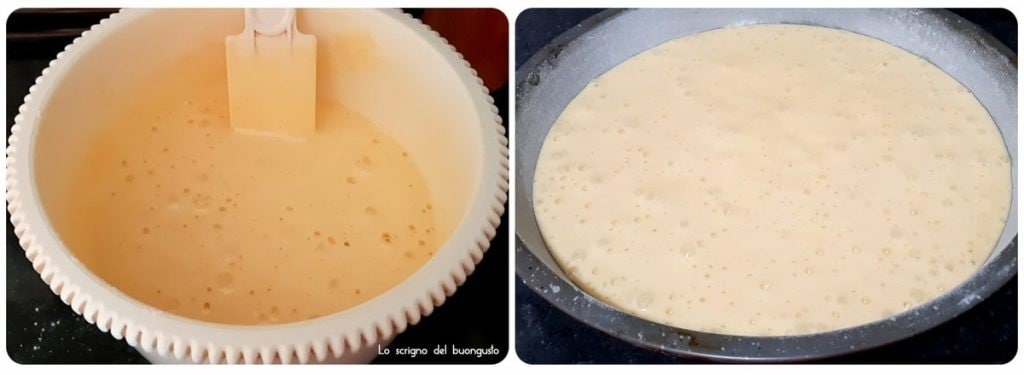 Lorsque le mélange est bien homogène, préparez un moule à gâteau de 26 cm de diamètre, beurrez et farinez-le, puis versez-y le mélange.