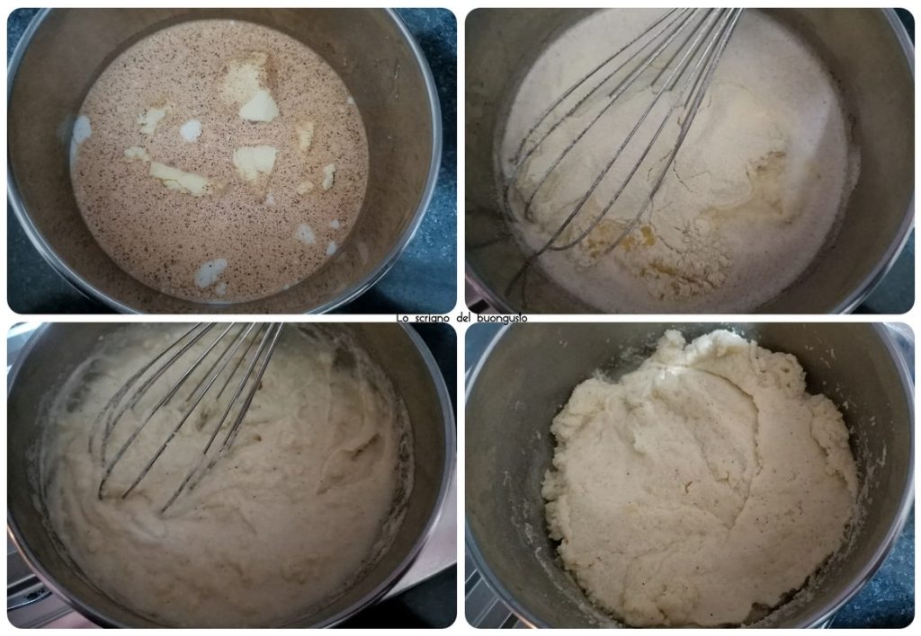 • Verser le lait dans une casserole avec 35 g de beurre, du sel et de la noix de muscade en poudre, porter à ébullition, puis hors du feu y verser la semoule en remuant continuellement au début avec le fouet puis avec la cuillère en bois ou en silicone.