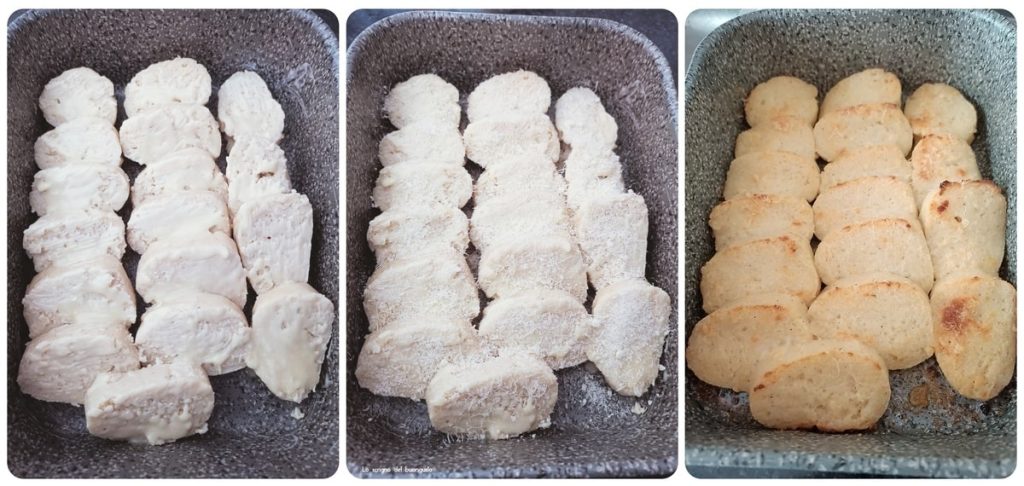 En alternative, nous pouvons créer un boudin, l’enrouler dans du papier sulfurisé huilé et bien le modeler, laisser refroidir et créer des tranches épaisses de moins d’un doigt d’épaisseur environ, avec un diamètre d’environ 4-5 cm.