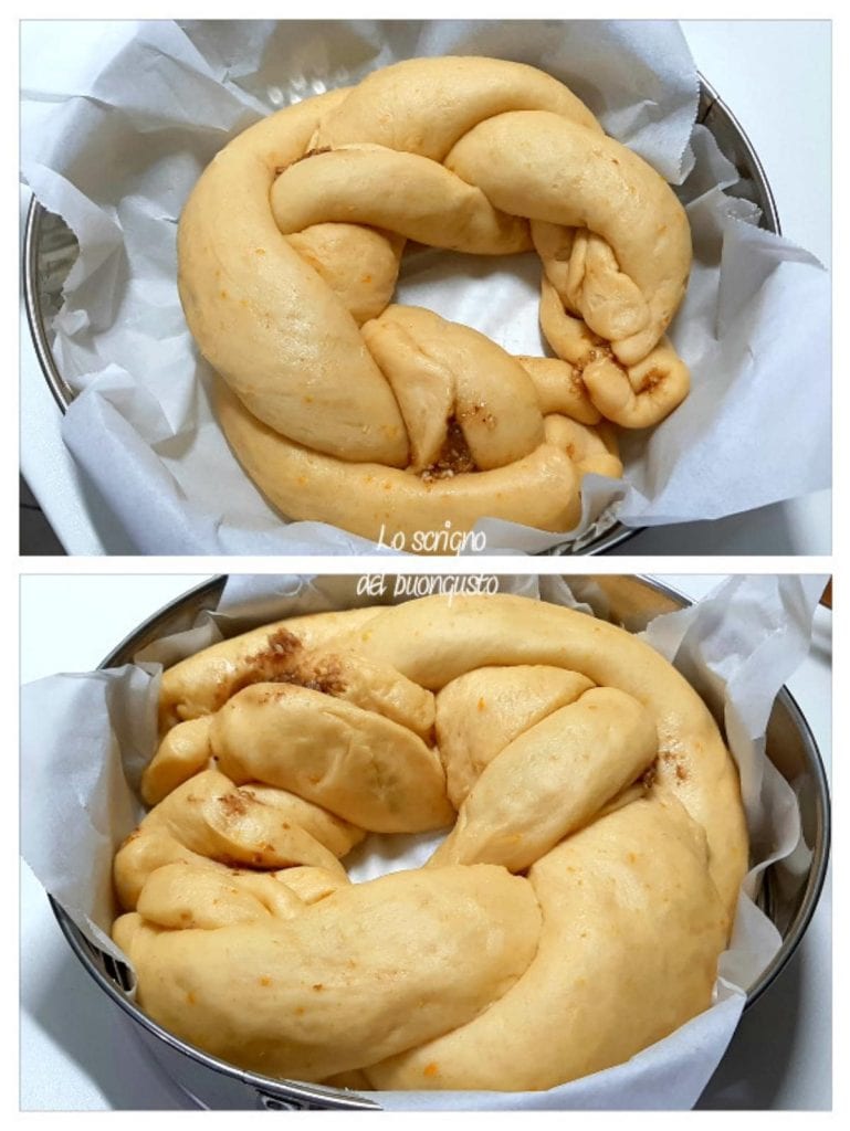 Commencez par mettre dans le robot les farines avec la levure de bière émiettée et les œufs précédemment battus, puis l’huile de graines, le sucre, la margarine, le lait tiède, le zeste d’orange râpé et commencez le pétrissage.