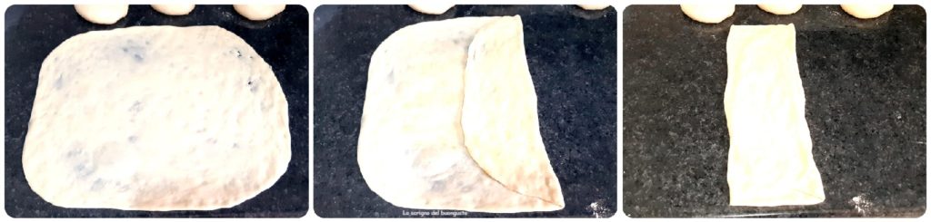 Une fois obtenu un rectangle fin, huiler encore la surface, saupoudrer de peu de semoule et plier la partie droite du carré vers le centre, la partie que vous avez repliée l’huiler et la saupoudrer de semoule.