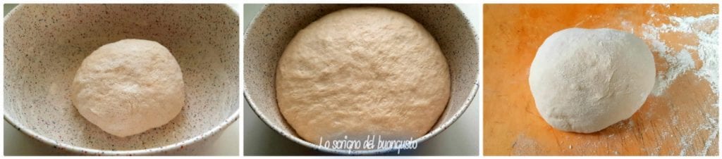 Une fois la levée terminée, transférer la pâte sur un plan de travail fariné et la travailler jusqu’à obtenir une consistance compacte mais souple.
