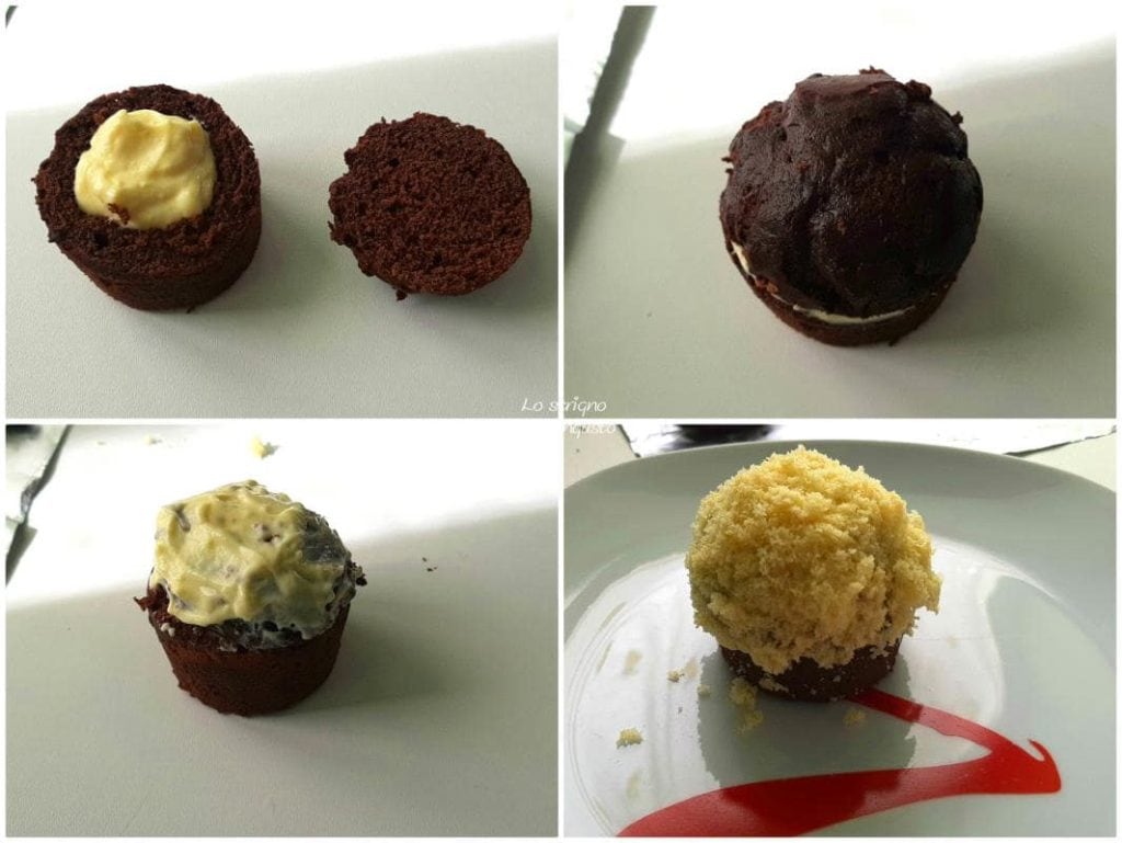 Prendre les muffins bien refroidis, couper la partie supérieure, imbiber avec un peu de rhum la partie la plus grande, faire un trou pas trop grand à l’intérieur