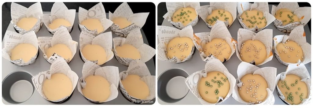 Remplir les moules environ aux ¾ de leur capacité et enfourner dans un four chaud à 180°C pendant 20-25 minutes en vérifiant la cuisson.