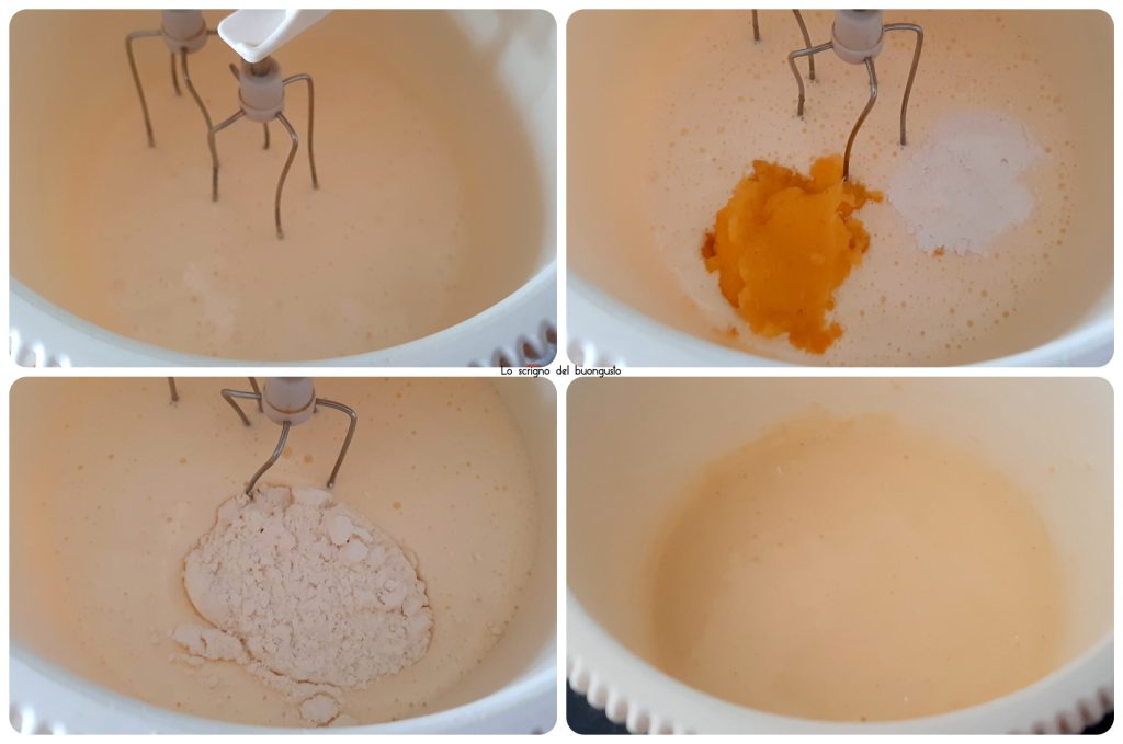 Dans le batteur, mettre les œufs avec le sucre et travailler à grande vitesse, puis ajouter le lait et l’huile et mélanger à basse vitesse.