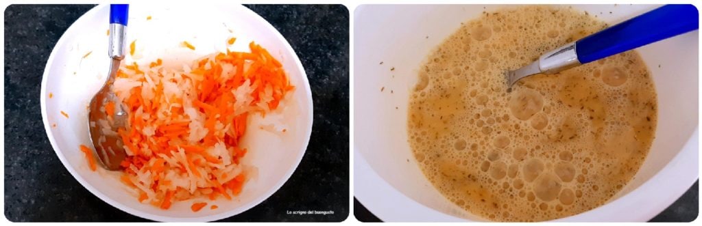 Prendre une poêle antiadhésive de 22-24 cm de diamètre, mettre 2 cuillères à soupe d’huile d’olive extra vierge, chauffer et y verser les légumes râpés, ajuster avec un peu de sel et de poivre, les cuire jusqu’à ce qu’ils flétrissent, environ 6-7 minutes.