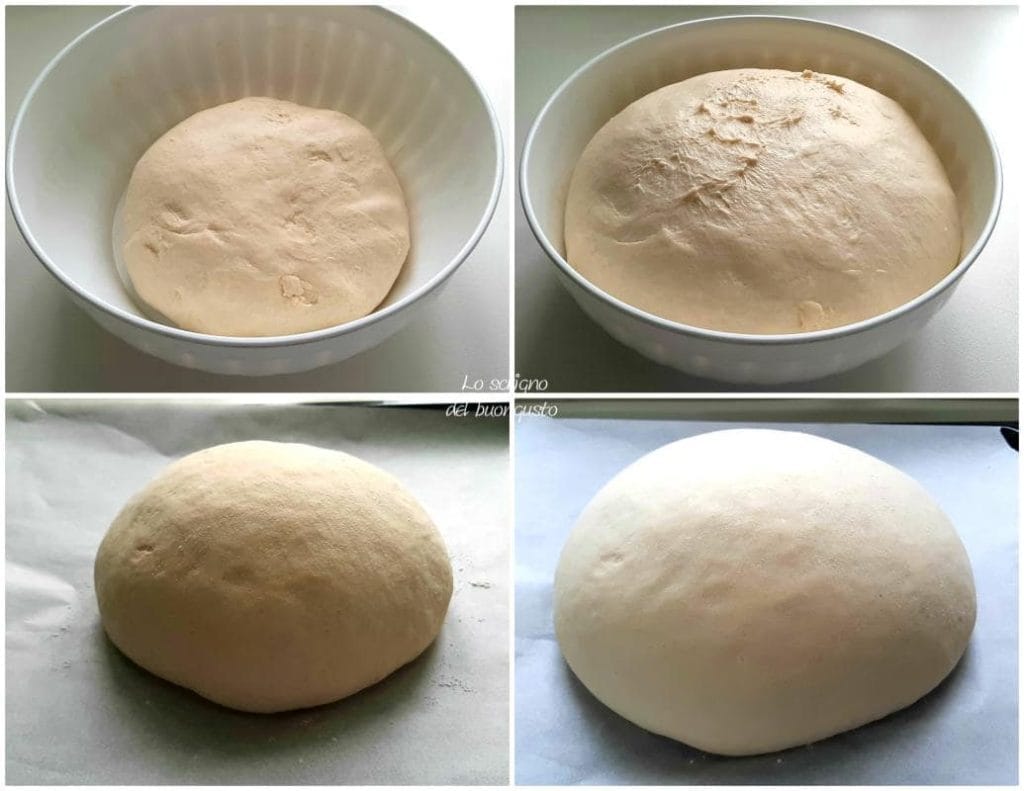Une fois la pâte bien amalgamée, vous obtiendrez une boule homogène, à ce stade, mettez-la à lever légèrement farinée dans un grand bol, couverte de film alimentaire dans un endroit chaud jusqu’à ce qu’elle double de volume, pendant environ une heure.