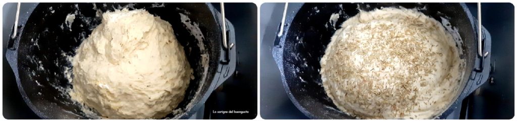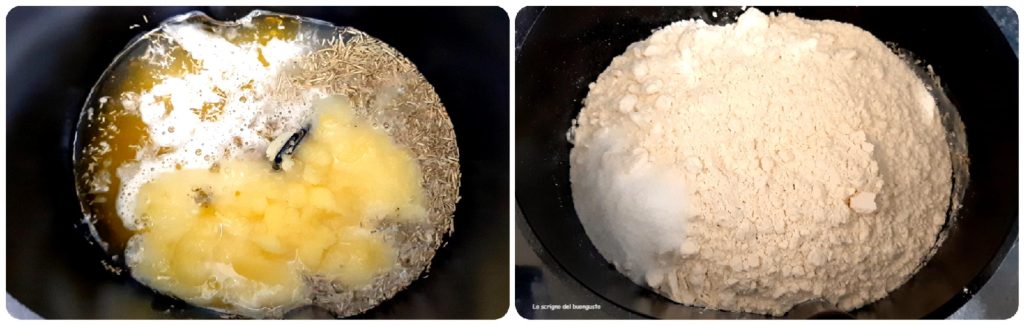 Entre-temps, prenez le panier de la machine à pain, insérez la lame à l’intérieur, mettez l’eau froide, l’huile, dès que les pommes de terre sont cuites, égouttez-les et écrasez-les, laissez-les refroidir un peu avant de les insérer dans le panier.