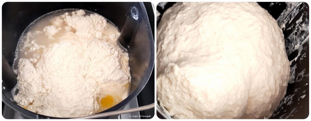 • Insérer la lame dans le panier de la machine à pain, ajouter d’abord les ingrédients secs puis l’huile et l’eau, insérer le panier dans la machine et sélectionner le programme pour pâte uniquement, sur ma Croustina Panasonic c’est le bouton 17 et il dure 45 minutes, mais vous pouvez sélectionner un programme juste pour la pâte qui se rapproche de ces temps si vous avez une machine différente de la mienne.