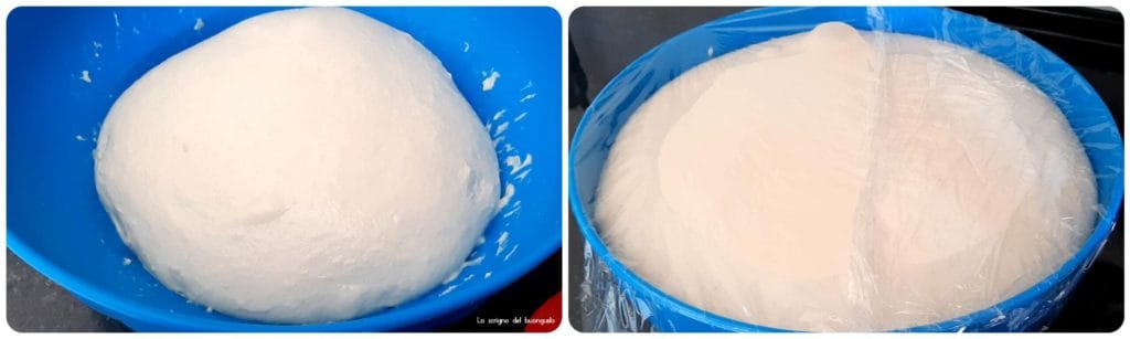 Une fois le travail terminé, transférer la pâte dans un grand bol où nous ferons lever la pâte, couvrir avec un film plastique pendant environ 2-3 heures.