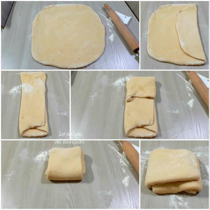 Farinez le plan de travail, travaillez un peu le pâton, juste ce qu’il faut pour obtenir une pâte ferme (utilisez les 100 g de farine disponibles pour le feuilletage comme prévu dans les ingrédients).