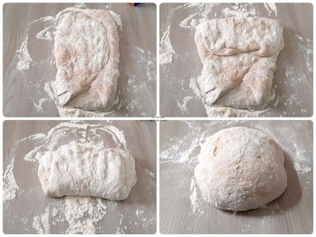 Une fois la levée obtenue, transférez la pâte sur un plan bien fariné, formez une boule encore souple, faites des plis en saupoudrant de la farine si nécessaire, en faisant au moins 3 tours de plis.