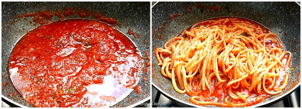 Quand l’eau atteint l’ébullition, nous pouvons tranquillement mettre les pâtes et à la fin de la cuisson, la sauce sera également prête.