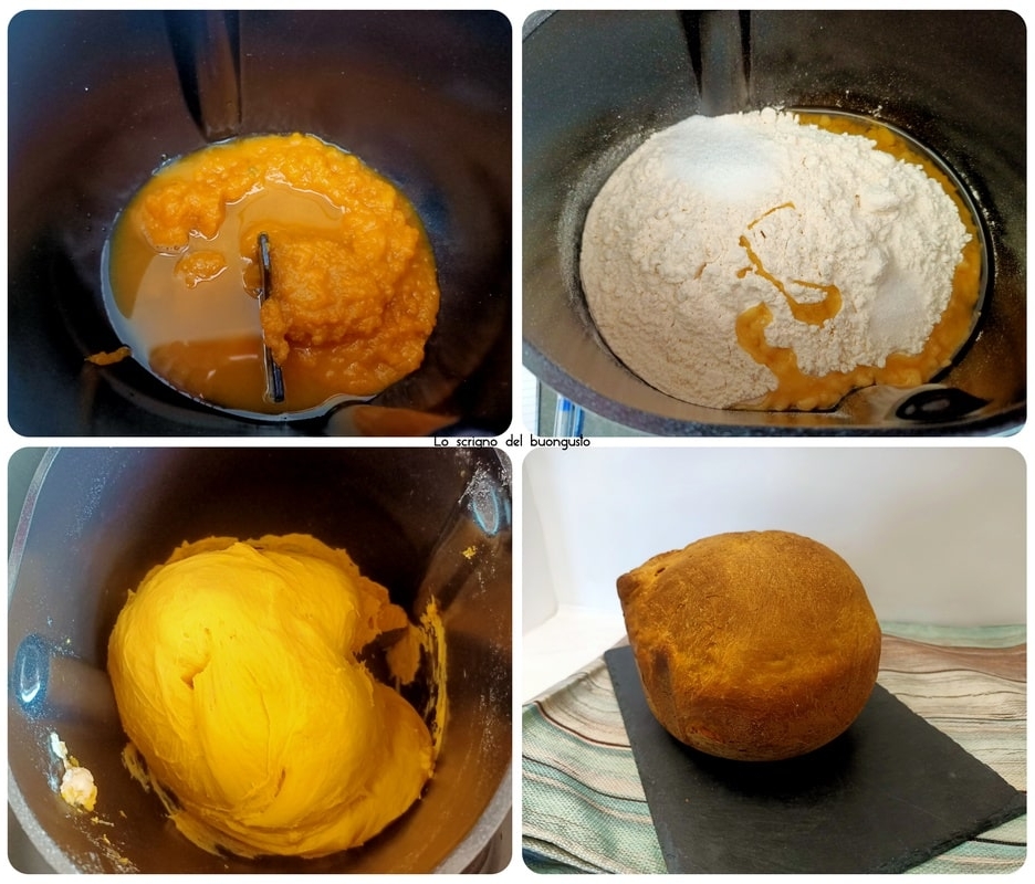 La petite miche croquante à la citrouille est née pour être entièrement réalisée avec la machine à pain, mais en suivant les ingrédients, vous pouvez aussi facilement pétrir à la main ou avec le robot, ce sera délicieux !