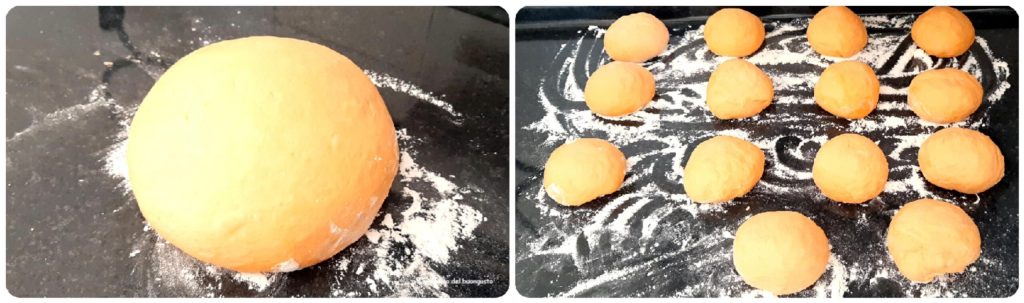 • Une fois la levée obtenue, transférer la pâte sur un plan de travail et former des boules d’environ 97-98 g, les laisser reposer 15-20 minutes….