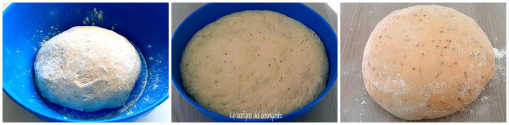 Une fois la levée obtenue, verser la pâte sur un plan de travail et la travailler pour obtenir à nouveau une boule homogène, laisser reposer 10 minutes, de sorte que la pâte s’étale plus facilement.