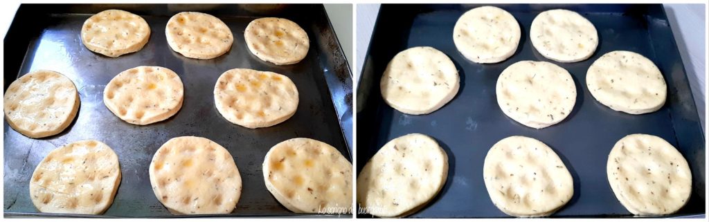 …les aplatir un peu avec les doigts et les badigeonner avec l’huile e.v.o., les laisser lever encore environ 30-40 minutes.