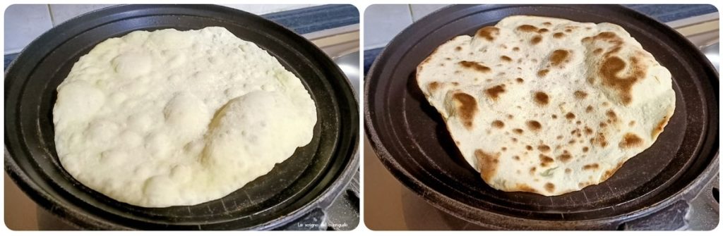 Pendant que la poêle chauffe, étaler la première piadina assez finement et, lorsque la poêle est suffisamment chaude, la déposer dessus, couvrir et laisser cuire environ 2 minutes de chaque côté.