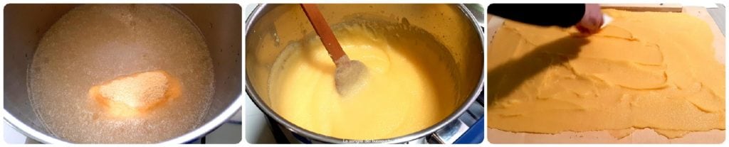Nous préparons une planche en bois propre et étalons la polenta sur toute la planche à une épaisseur d’environ ½ cm.