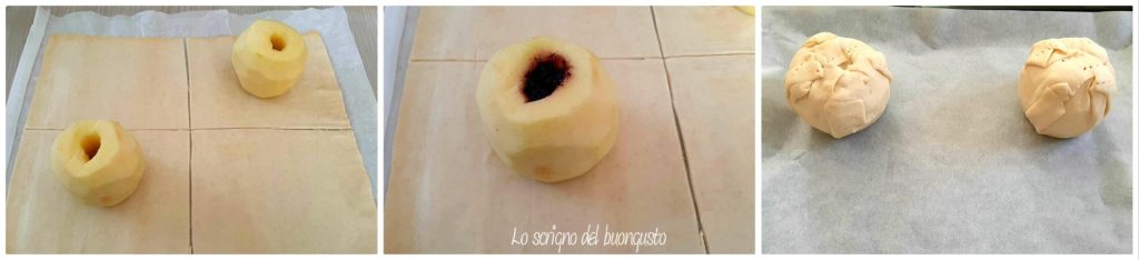 Placer les pommes sur une plaque de four recouverte de papier sulfurisé, mouiller la pâte en la badigeonnant d’eau et enfourner à 200°C pendant environ 30 minutes.