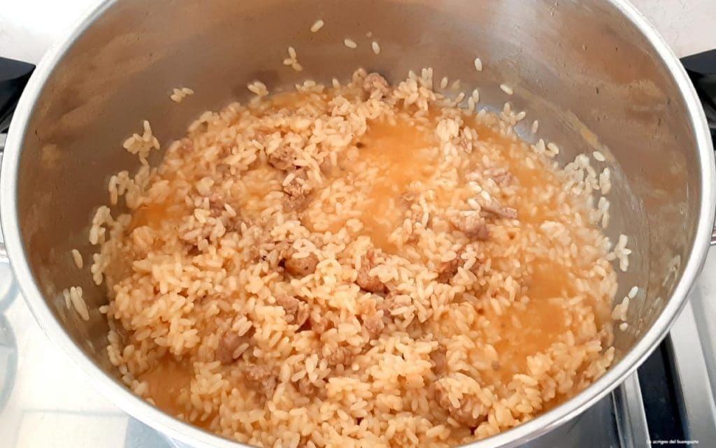 Prenez une casserole à fond épais, mettez l’huile d’olive extra vierge pour faire revenir l’oignon finement haché pendant quelques minutes, puis ajoutez la chair à saucisse émiettée et continuez la cuisson pendant encore 5-6 minutes.