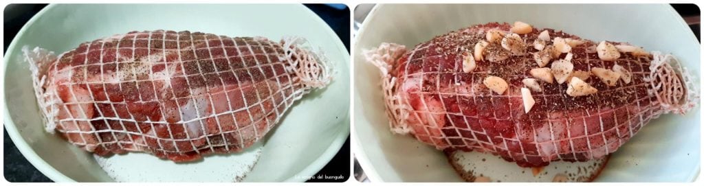 Tout d’abord, prendre le rôti, le saupoudrer de sel et de poivre tout autour, masser la viande, puis mettre les gousses d’ail tranchées tout autour et mettre au réfrigérateur pendant au moins une demi-heure.