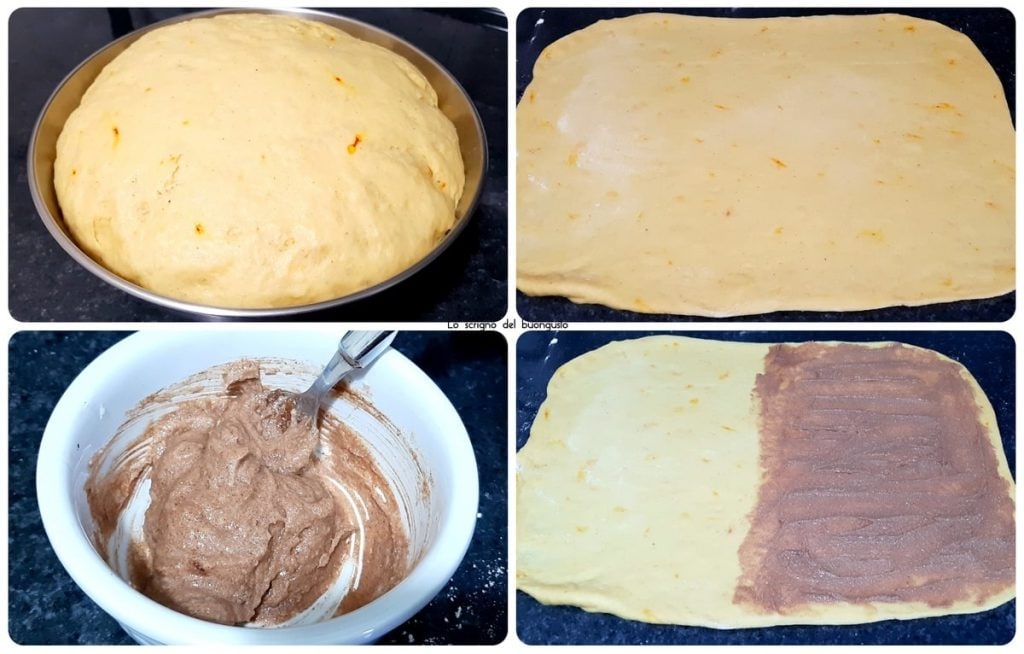 Une fois la levée obtenue, étalez la pâte avec un rouleau à pâtisserie pour former une feuille assez fine, dans un petit bol mélangez les ingrédients pour la garniture pour créer une crème douce.