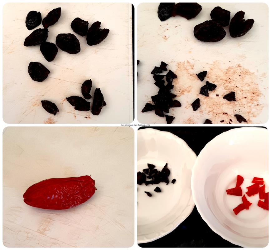 Commencez par préparer les olives en les dénoyautant et en découpant de très petits triangles, puis videz le piment de ses graines et découpez-le en lanières, découpez tous les morceaux pour obtenir la langue, j’ai fait une petite entaille à la pointe de chaque morceau pour créer une langue bifide.