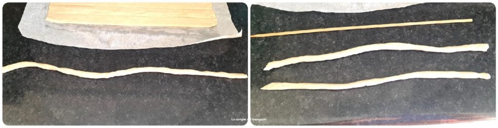 Prenez la pâte feuilletée, déroulez-la et découpez toutes les bandes de 2 cm de large du côté le plus court
