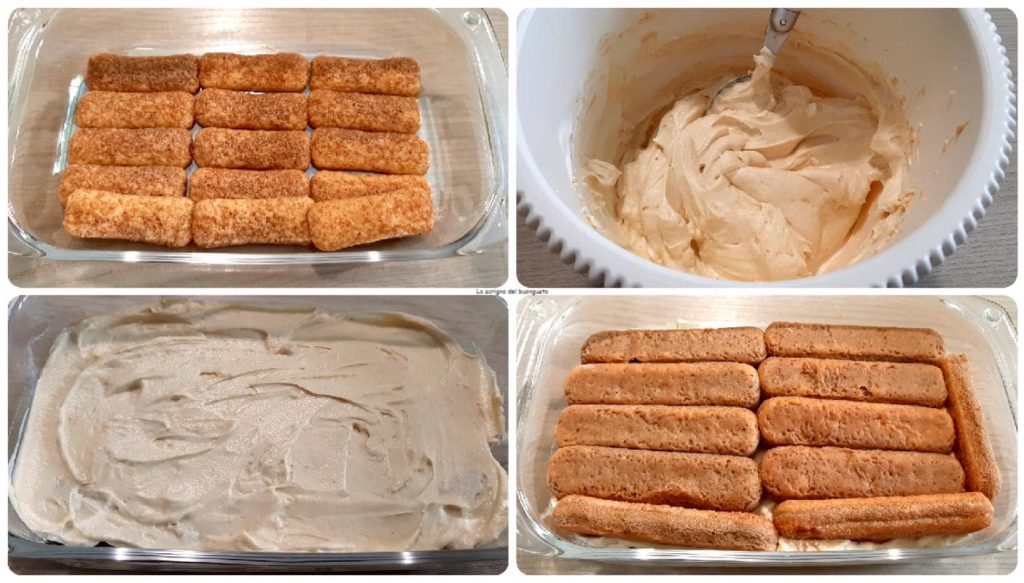 Maintenant, trempons les pavesini dans le mélange avec le café et créons la base dans le plat à gratin pour réaliser le tiramisù. Ensuite, mettons la moitié de la crème, puis trempons les boudoirs et formons la deuxième couche