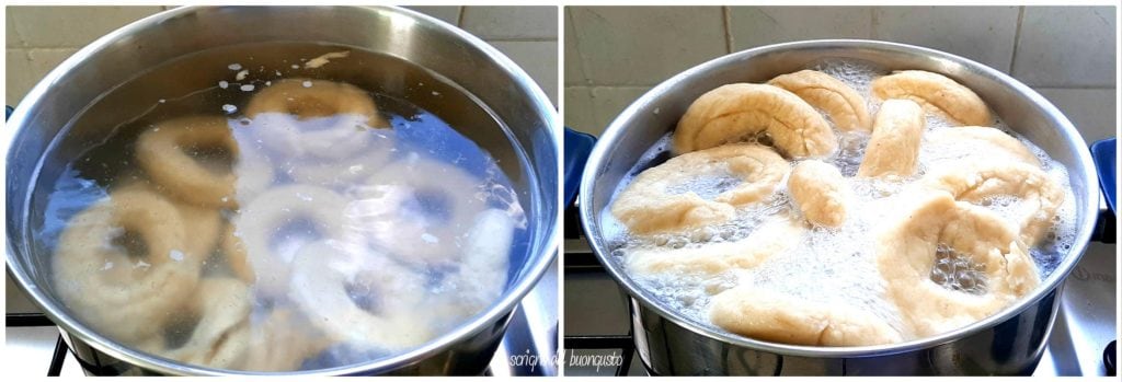 Découper des morceaux de pâte d’environ 53-54 gr chacun à partir desquels nous créerons des cordons d’environ 18 cm de long un peu plus épais qu’un doigt et refermer en donnant la forme du tarallo et inciser une ligne en surface avec un couteau.