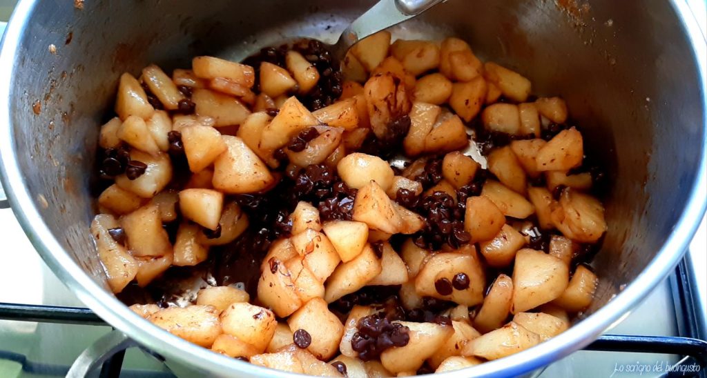 Dans une casserole en acier, mettez les pommes, le sucre, la cannelle et le rhum et faites cuire pendant une paire de minutes, puis laissez refroidir un peu et ajoutez les pépites de chocolat en remuant bien.