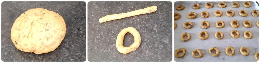 Une fois la consistance obtenue, prenez des morceaux de pâte, façonnez des cordons d’environ un doigt et ½ pas trop épais et fermez-les en petit bagel.