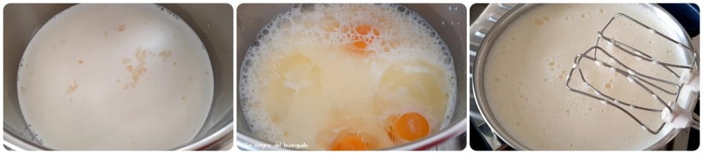 Dans une casserole à bords hauts, mettre le lait et le chauffer à une température d’environ 50 degrés, quoi qu’il en soit, même s’il est plus chaud, l’important est qu’il ne bouille pas.
