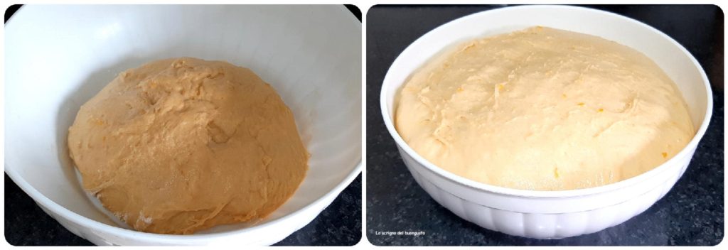 Travailler la pâte pendant 10 minutes, puis la verser dans un grand bol légèrement fariné, couvrir et mettre au four avec la lumière allumée et mettre dans le four également une casserole avec de l’eau très chaude… cela aide à la levée.