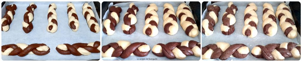 Une fois levée, reprendre la pâte et former des petits boudins avec chaque pâte, puis former des tresses à 3 en joignant un boudin blanc, un marron et un blanc avec la moitié de la pâte de chaque couleur et faire ensuite le contraire, c’est-à-dire un blanc et 2 marrons pour utiliser les deux pâtes sans restes.