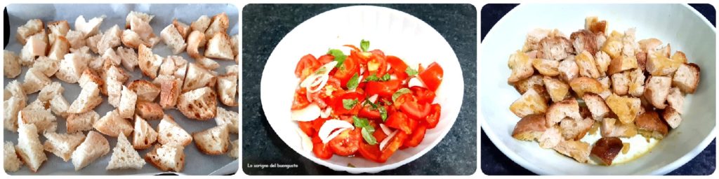 Dans un bol, mettez le pain grillé, assaisonnez avec du sel, une partie de l’huile d’olive extra vierge et mélangez bien.