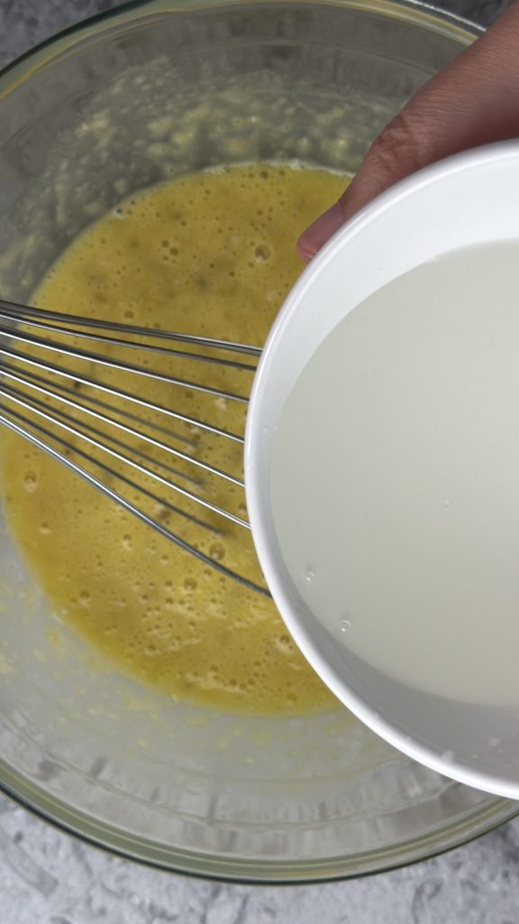 Poursuivez avec l’huile de coco versée en filet tout en mélangeant.