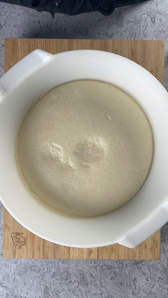 Donne-lui une forme sphérique, transfère-la dans un bol fariné et laisse-la lever – couverte – jusqu’à ce qu’elle double de volume.Une fois levée, dégaze la pâte et transfère-la sur un plan fariné.