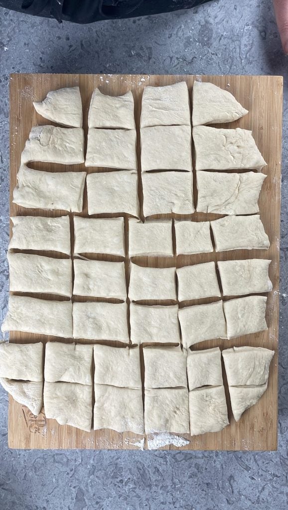 Étale-la et donne-lui une forme rectangulaire avec les mains ou avec un rouleau.Divise la pâte en morceaux de 3-4 cm, il n’est pas nécessaire d’être précis.