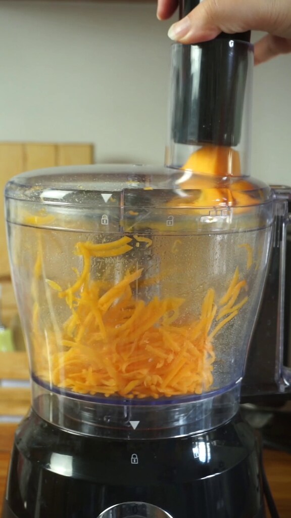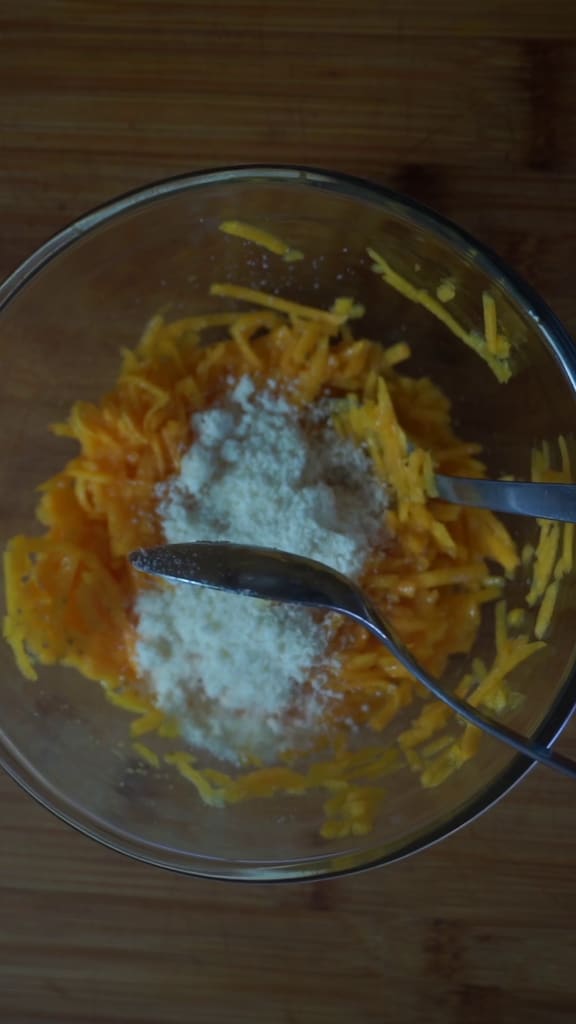 Commence la préparation des beignets de potiron et parmesan, en coupant et épluchant le potiron, il te faudra 180g. Râpe-le avec une râpe électrique ou manuelle à gros trous.