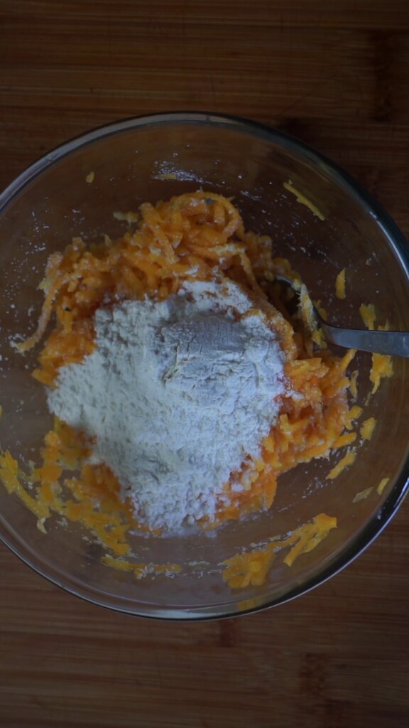 Transfère le potiron râpé dans un saladier et ajoute un œuf de taille moyenne; mélange bien jusqu’à ce que les deux ingrédients soient complètement incorporés.
