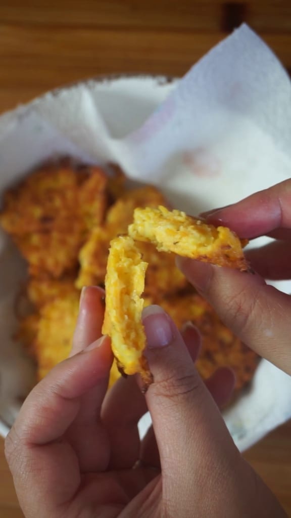 Transfère les beignets de potiron et parmesan dans une assiette recouverte de papier absorbant pour éliminer l’excès d’huile.