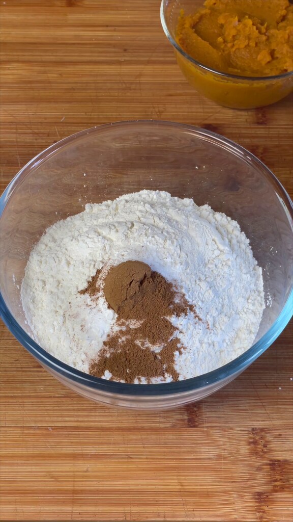 Dans un bol, mets la farine 00, la fécule de maïs, le bicarbonate, le sel et les épices pour tarte à la citrouille. Mélange bien avec une maryse ou une cuillère.