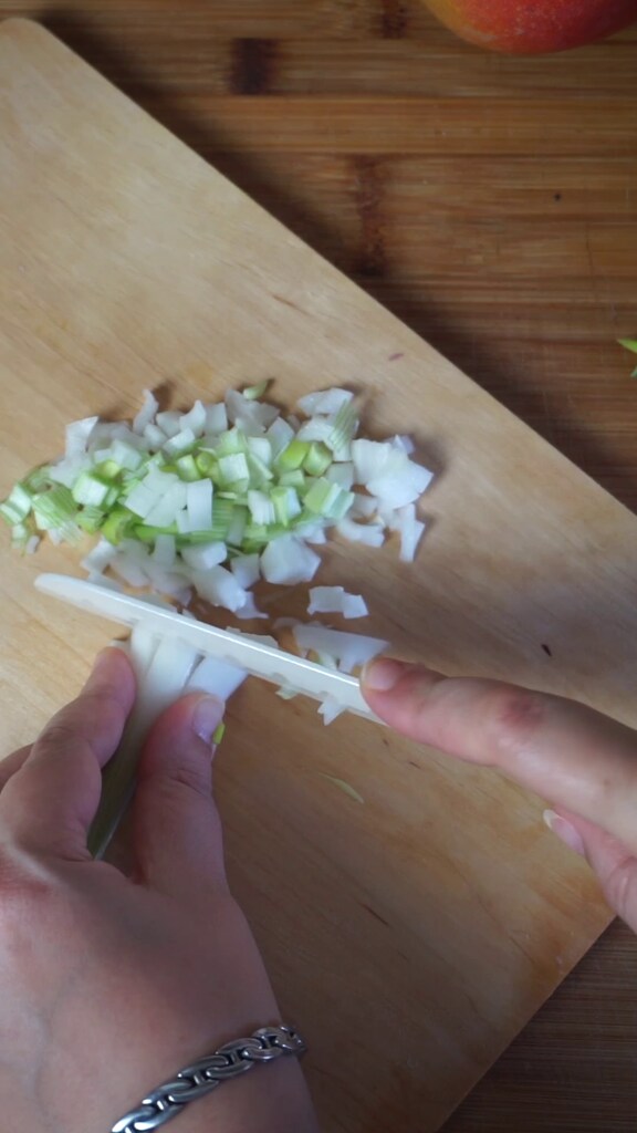 Commencez la préparation du bol de riz au poulet et à la mangue en nettoyant et en hachant finement la ciboule.