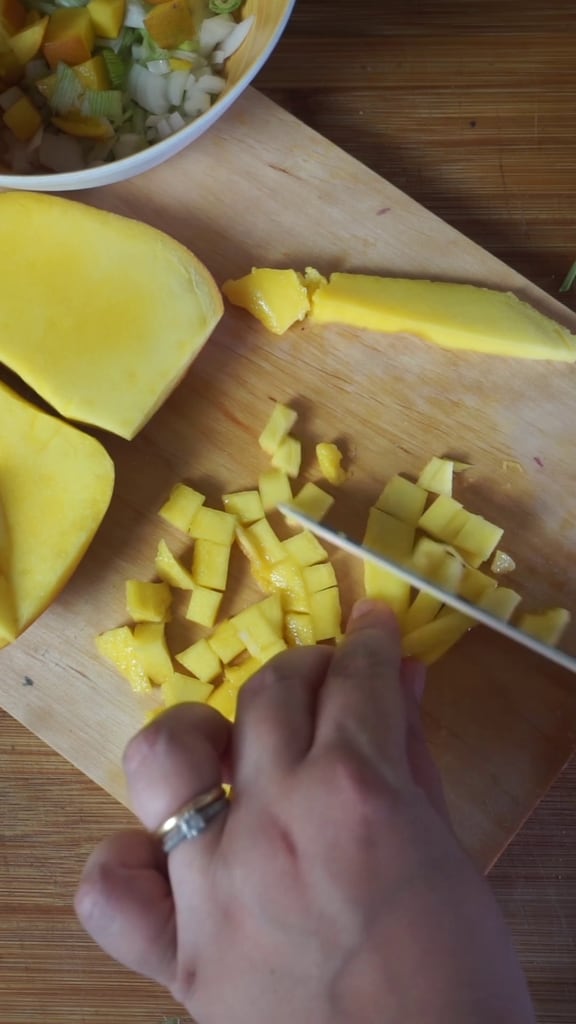 Pelez la mangue, tranchez-la et découpez chaque tranche en petits cubes.