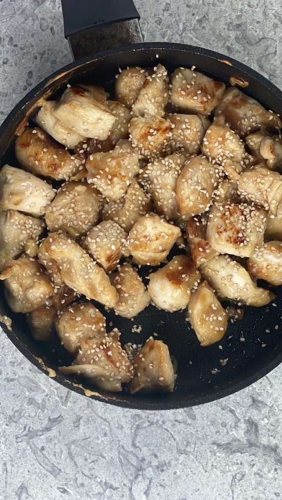 • Chauffe dans une poêle l’huile de graines : idéalement, ce serait celle de sésame mais l’huile d’arachide convient également. Ajoute le poulet et fais-le revenir à feu vif pendant quelques minutes.